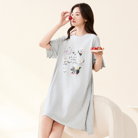 芬腾可安纯棉睡裙女夏季新款甜美可爱卡通印花短袖薄款中裙圆领
